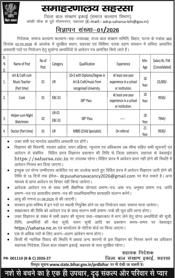 | Name of Post: | Bihar Jila Baal Sanrakshan DCPU Saharsa Recruitment 2026 |
